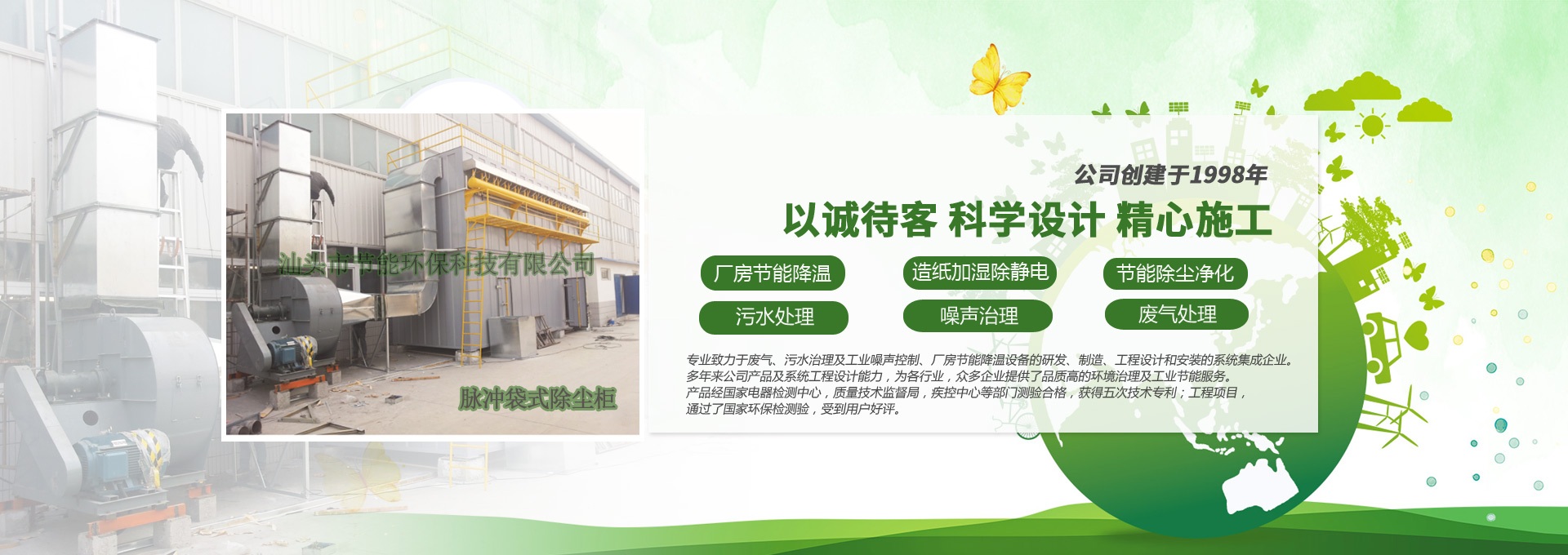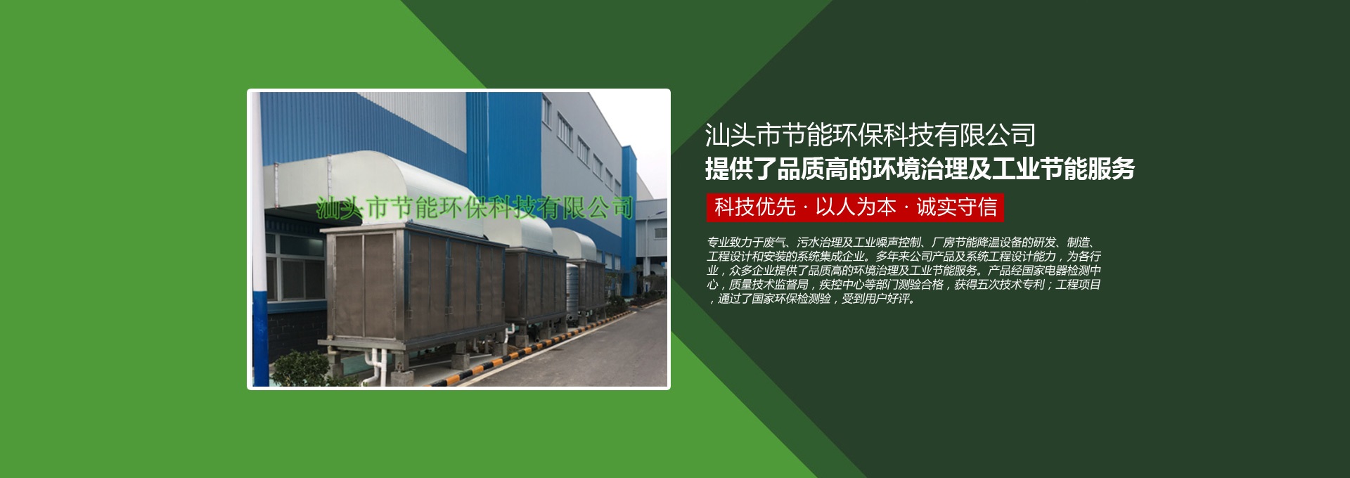 汕頭市節(jié)能環(huán)??萍加邢薰緞?chuàng)建于1998年,是一家專(zhuān)業(yè)致力于廢氣、污水、粉塵、噪聲治理,廠(chǎng)房節(jié)能降溫設(shè)備的研發(fā)、制造、工程設(shè)計(jì)和安裝的系統(tǒng)集成企業(yè)。多年來(lái)公司產(chǎn)品及系統(tǒng)工程設(shè)計(jì)能力,為各行業(yè),眾多企業(yè)提供了品質(zhì)高的環(huán)境治理及工業(yè)節(jié)能服務(wù)。產(chǎn)品經(jīng)國(guó)家電器檢測(cè)中心,質(zhì)量技術(shù)監(jiān)督局,疾控中心等部門(mén)測(cè)驗(yàn)合格,獲得五次技術(shù)專(zhuān)利;工程項(xiàng)目通過(guò)了國(guó)家環(huán)保檢驗(yàn)檢測(cè),受到用戶(hù)好評(píng)。